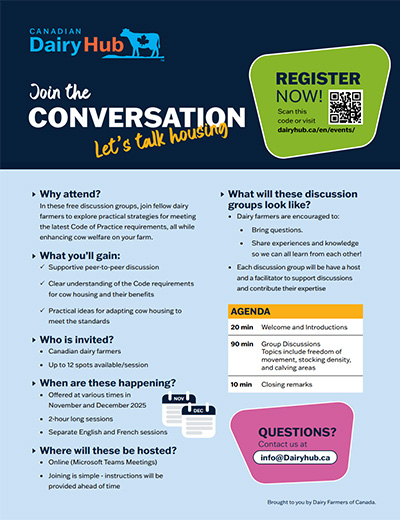 In these free discussion groups, we’ll explore Code of Practice requirements for cow housing, the reasoning behind them, and practical ideas for adapting housing. For more event details, check out the flyer, here!