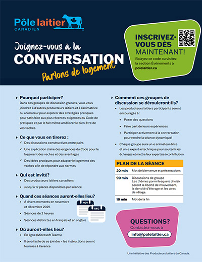 Pendant ces groupes de discussion gratuits, nous explorerons les exigences du Code de pratiques pour le logement des vaches laitières, les raisons qui les motivent et des idées pratiques pour s’y adapter. Pour plus de détails, voir le feuillet promotionnel ici!